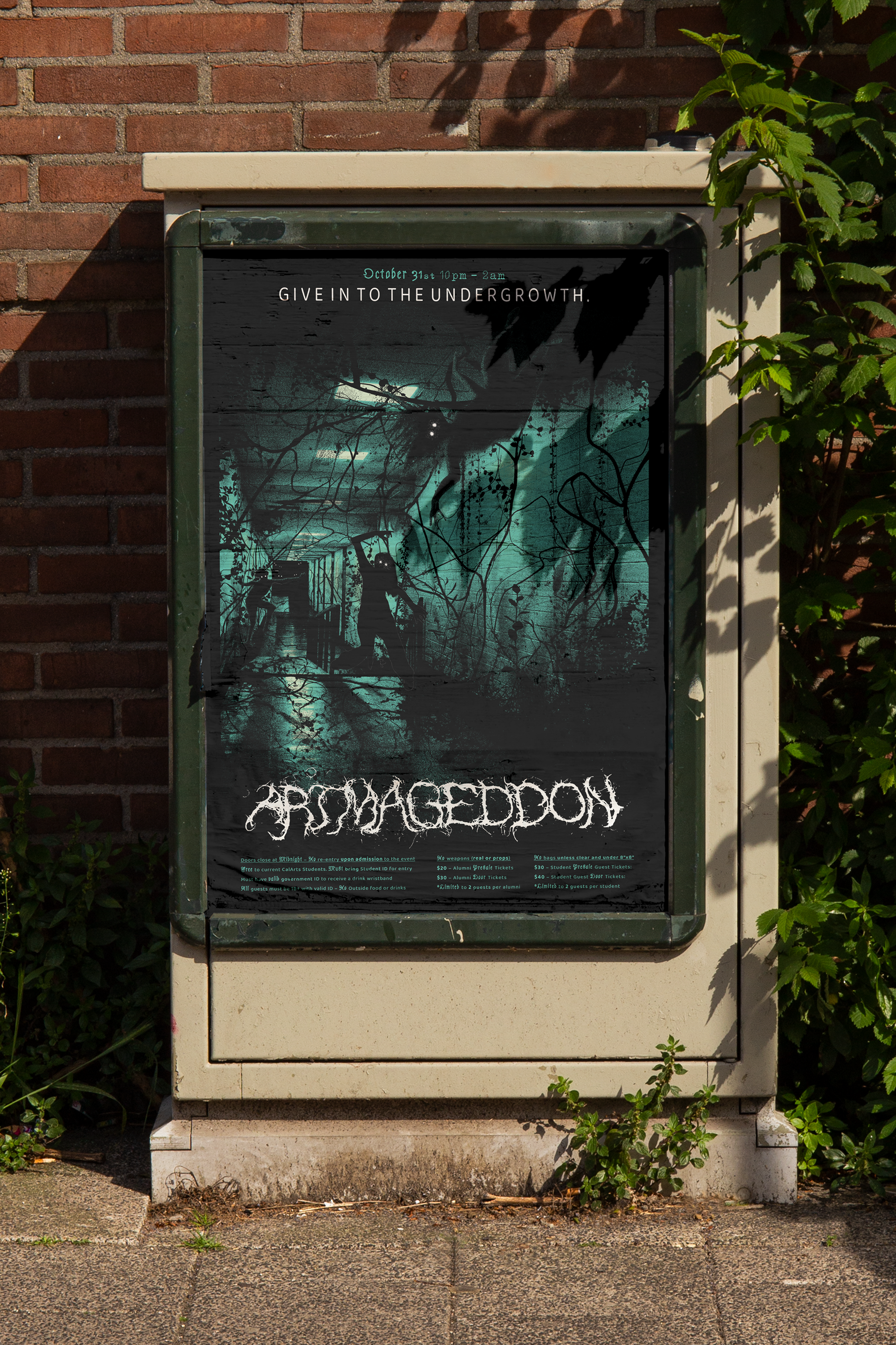 As part of the graphic design program's history of designing posters for the annual Halloween rave, this year's theme, Artmageddon, presents a unique challenge. Created in a group with Clint Kessler and Arlo Robbins, the collaborative poster represents the main stage– undergrowth, post-apocalyptic theme.